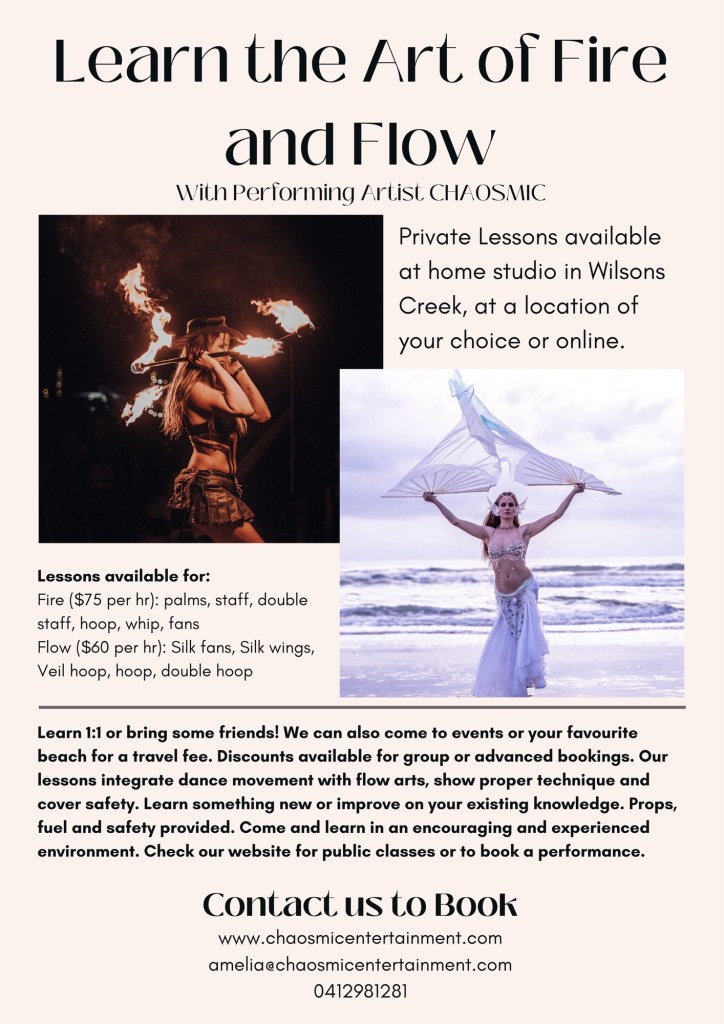 All lessons taught by founding artist, CHAOSMIC, who has a background in embodied movement, contemporary, ballet, jazz. Lessons integrate dance with flow arts as well as teaching students fire safety and performance techniques. Lessons can cater to neurodivergent students. Please wear 100% natural fibres to your fire lesson, fuel and safety is provided.