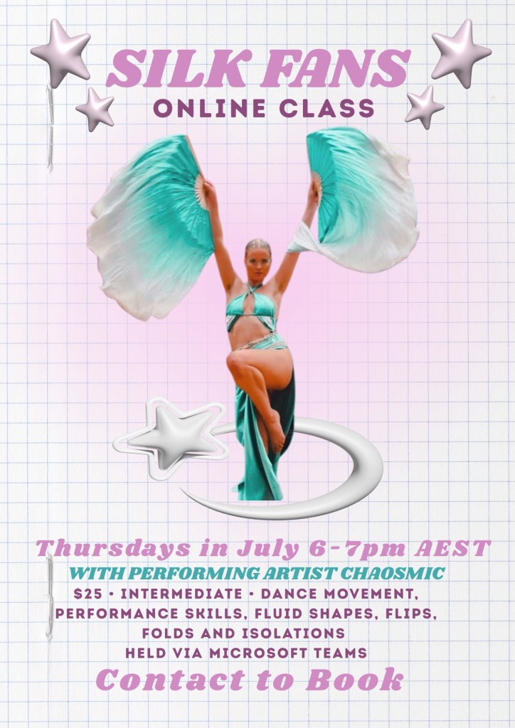 From 6-7pm AEST join us via Microsoft teams to dive into the mesmerising world of silk fans. These classes are at an intermediate level and students should be confident in holding fans in a closed and open grip.