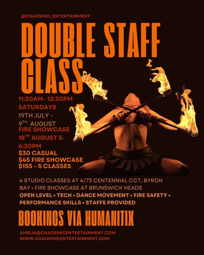 Ignite your flow and connect with the art of fire in this empowering 4-week double staff series led by international performing artist CHAOSMIC. Explore technique, embodied movement, performance skills, dance fusion, and fire safety in a playful and welcoming space.