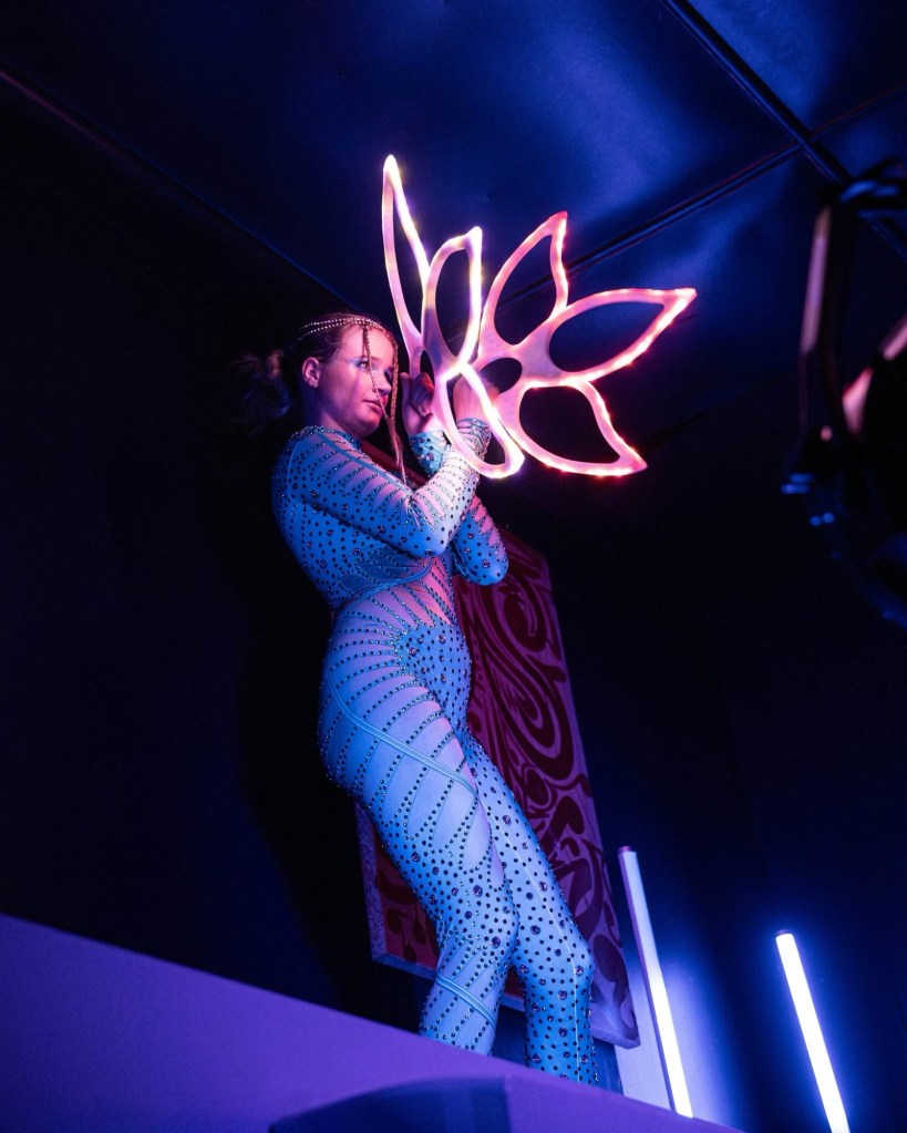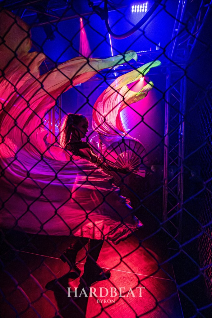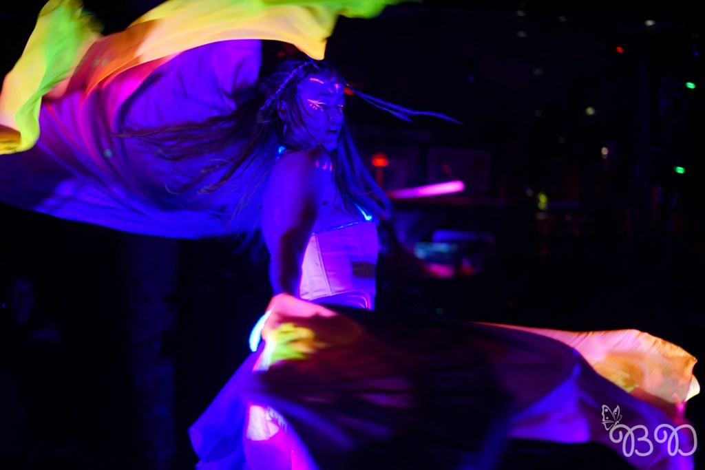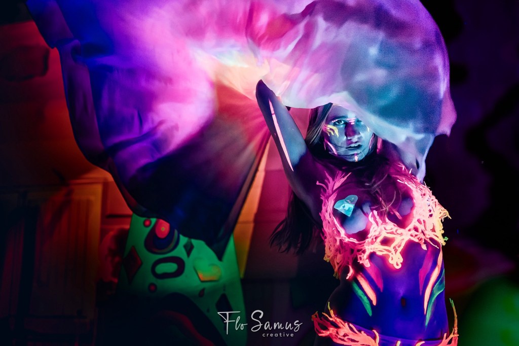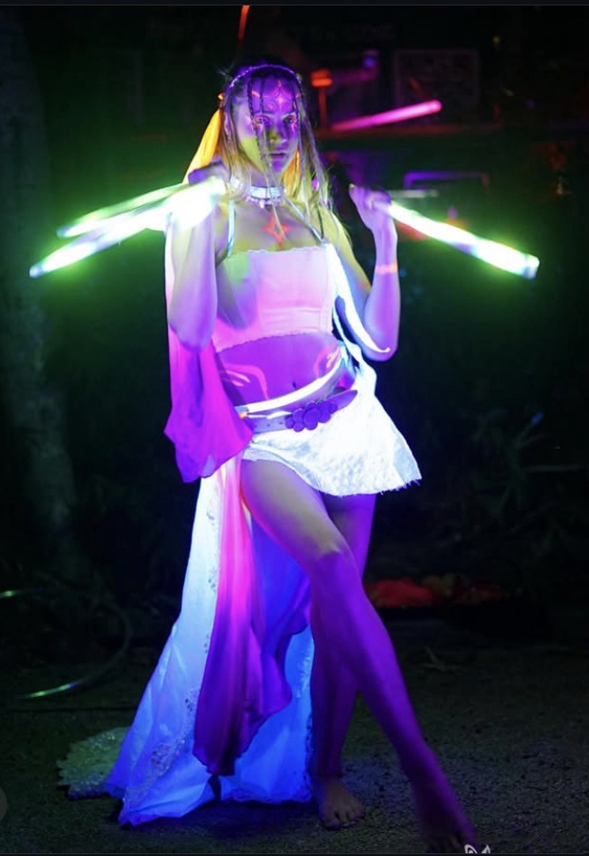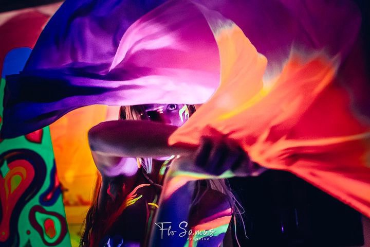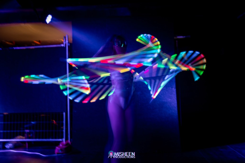 Available as a feature performance. Props include Hoop, Isis wings Silk fans, Silk Wings, Veil hoop, hoop and double hoop. We can also do UV aerials such as Lyra and Pole. Performer/s will come with their own UV lights and need access to a PowerPoint and dark space.